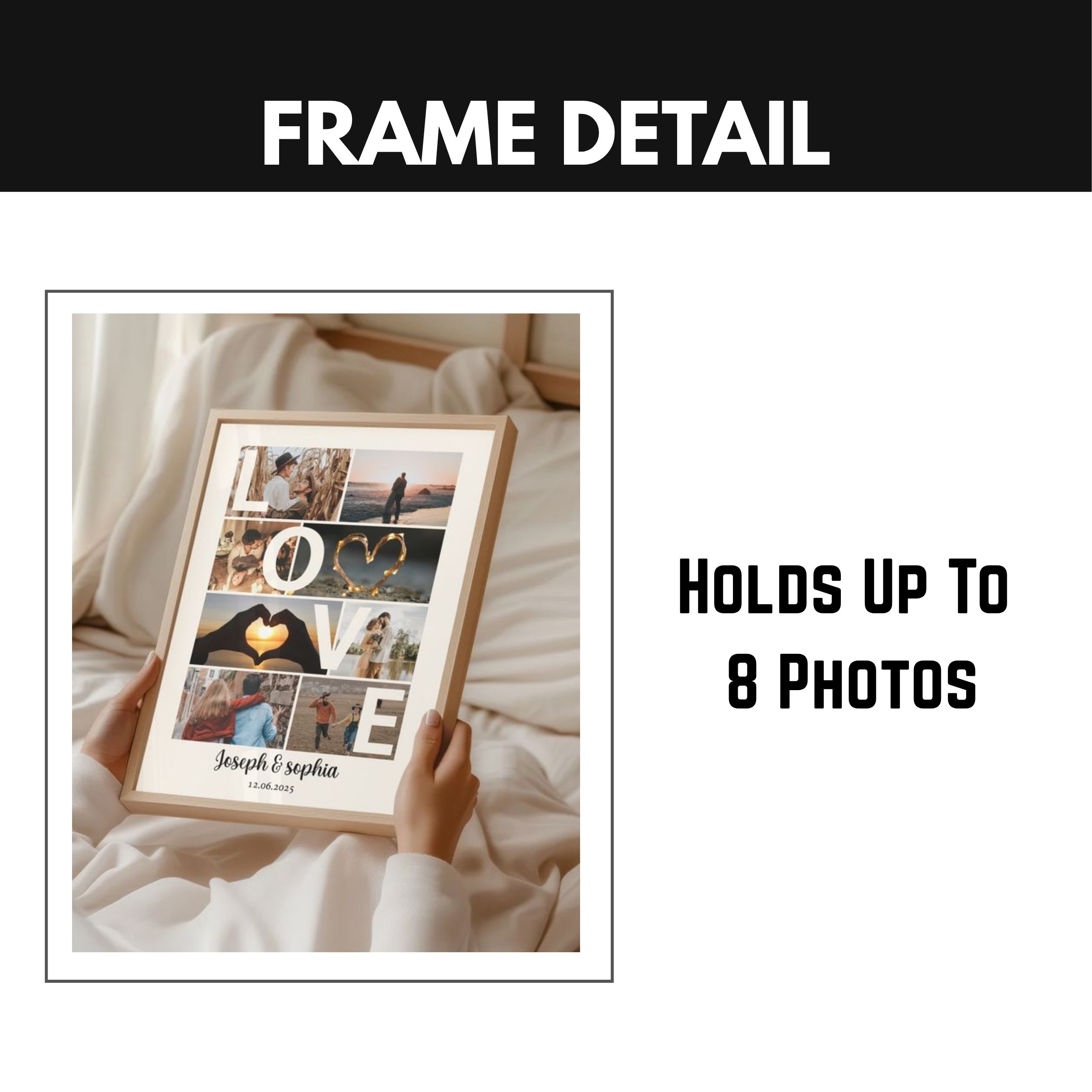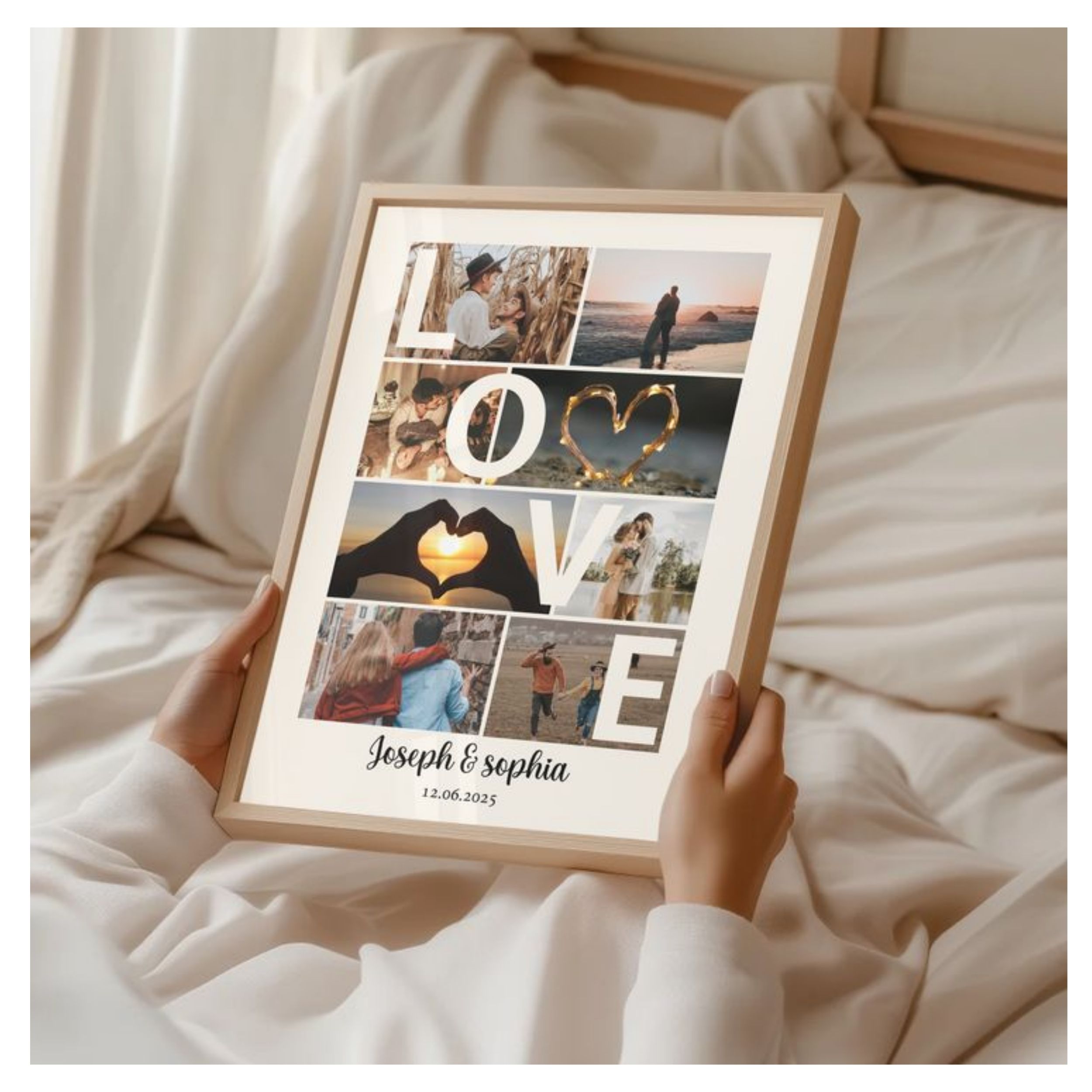 This Personalized LOVE Photo Collage Frame turns your favorite moments into a stunning piece of art. Each letter of the word “LOVE” is creatively blended with your photographs, forming a collage that captures laughter, trips, hugs, sunsets, and all the little moments that make your relationship extraordinary.