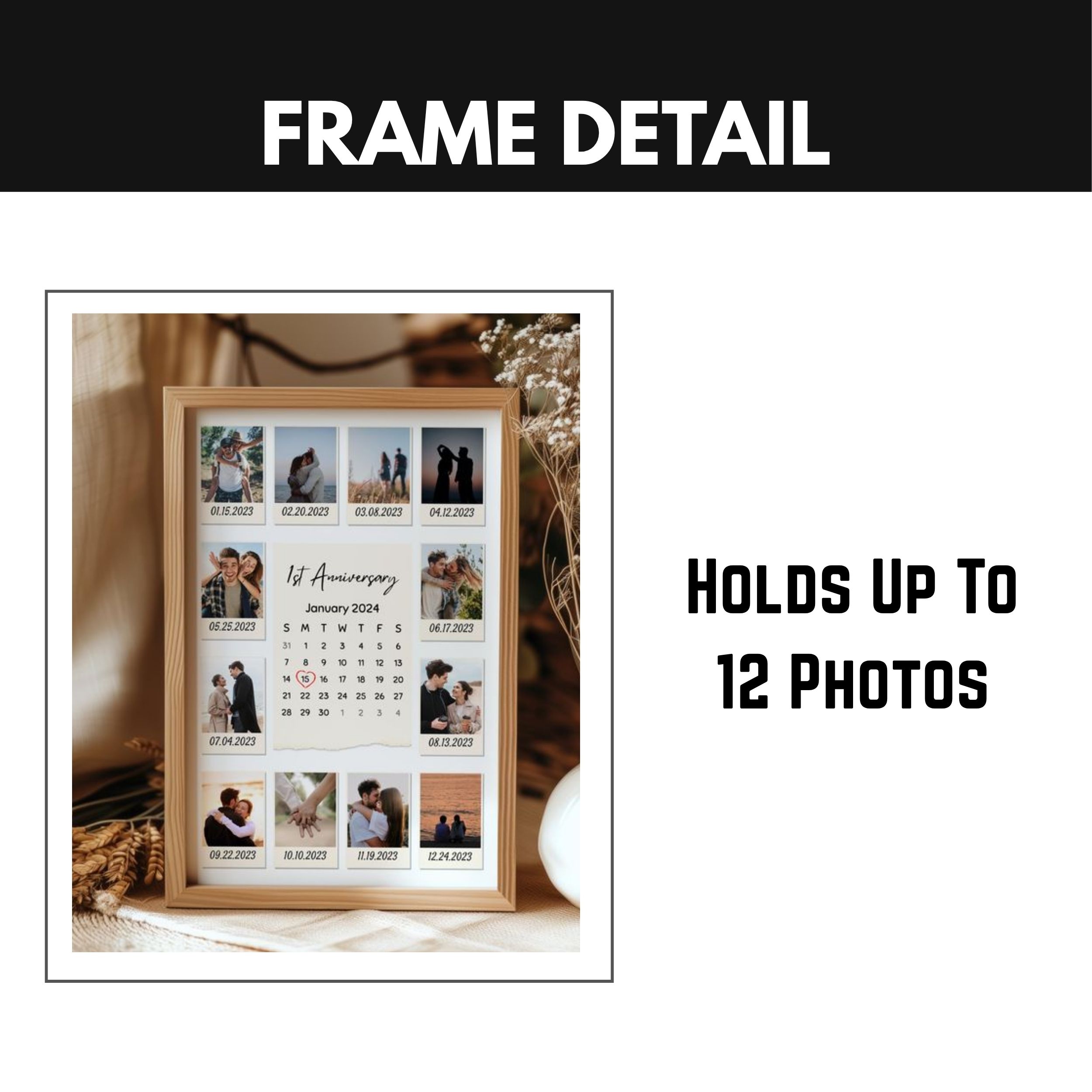 Printed on premium-quality material and framed in a stylish wooden finish, each picture captures a beautiful moment—your first trip together, proposal, romantic dates, and unforgettable laughter. The highlighted date on the calendar adds a sentimental touch that makes this frame one-of-a-kind.
